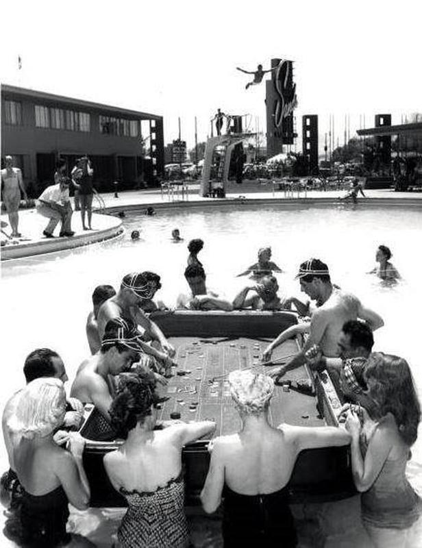 A lot of floating "crap" here - Players at a floating craps table in the Sands Hotel Pool - Las Vegas, 1954
