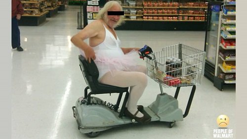 This man is a pretty, pretty ballerina. He has donned tights, a leotard, a tutu, and some slippers for his trip to the store. That's totally fine, but we're not buying it. If you can't walk the aisles unassisted, there's no way you're heading to a recital later. He's also stocking up on sodas and cookies; that's a major no-no among real dancers. Imposter!